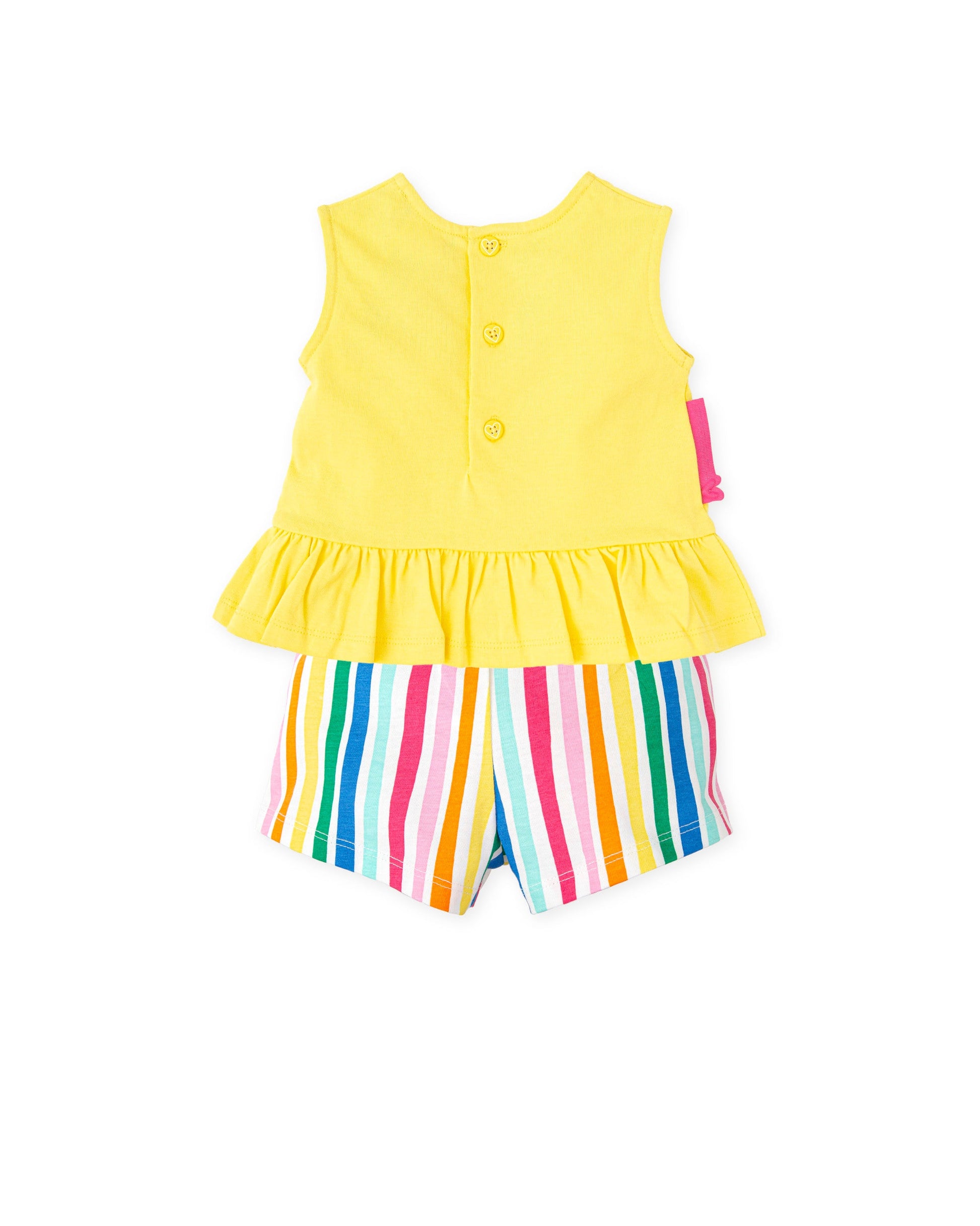 This vibrant 2-piece set features a delightful yellow T-shirt adorned with a charming floral print, paired with multicolor striped shorts, perfect for playful adventures and sunny days out. Crafted from 100% cotton, it ensures comfort and durability for your child's active lifestyle.