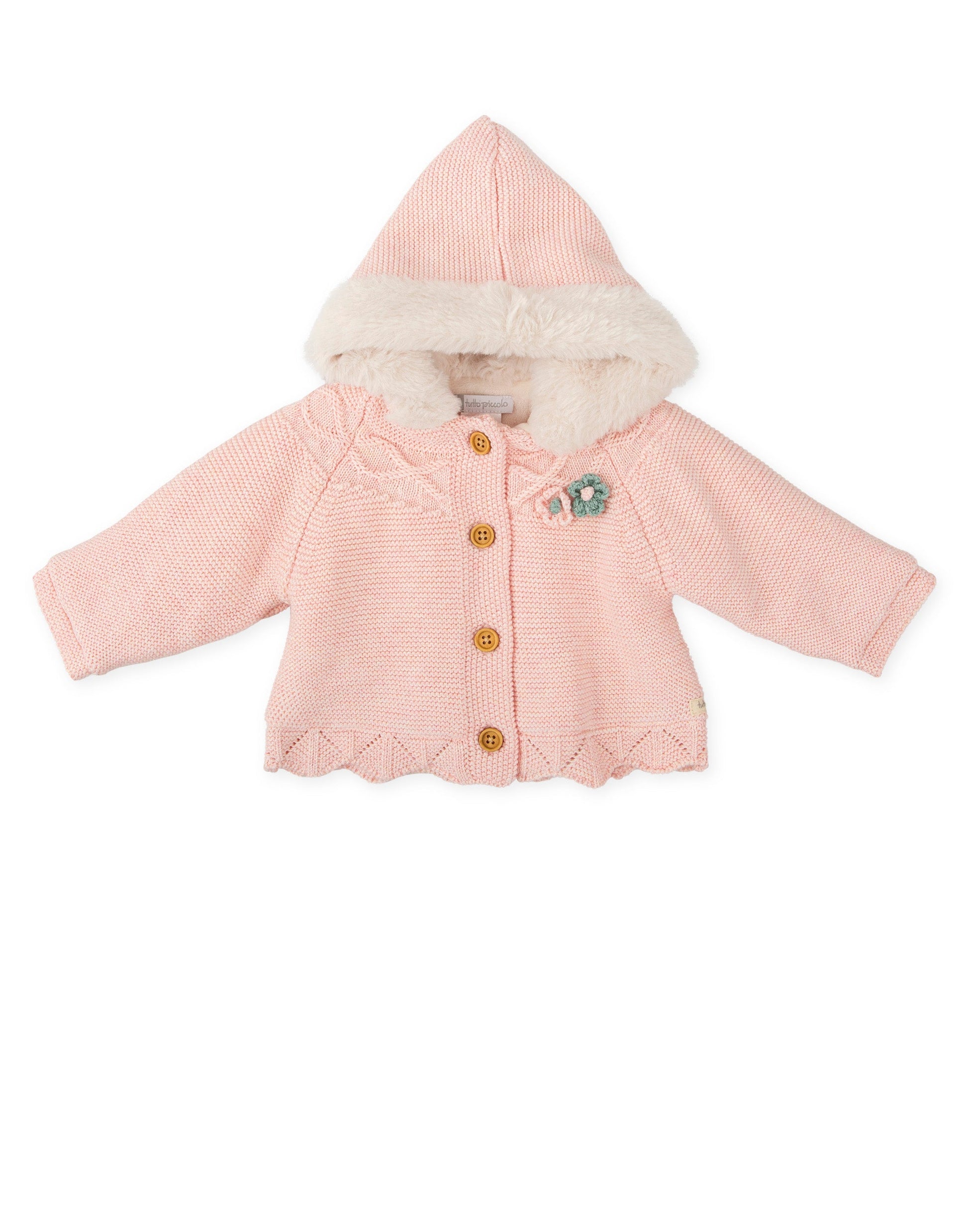 Soft Pink Baby Hooded Knit Coat with Faux Fur Lining