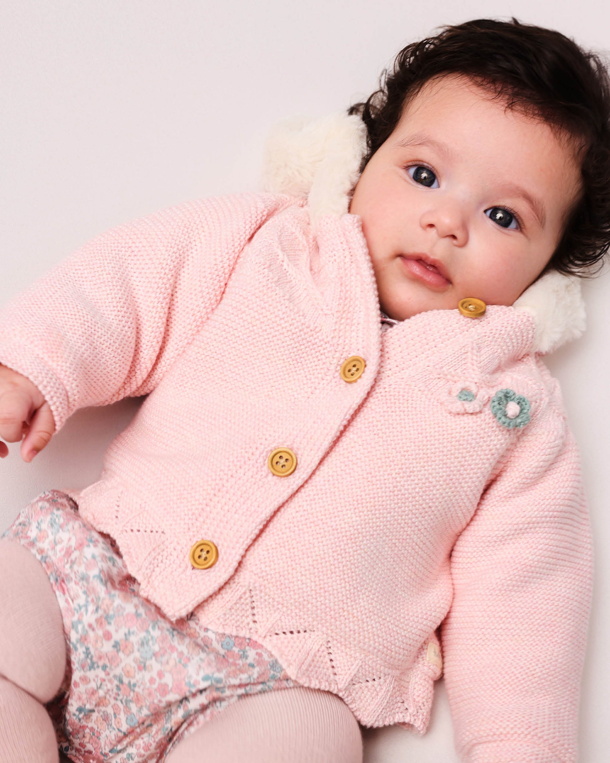 Embrace warmth and style for your baby with our Soft Pink Baby Hooded Knit Coat, expertly crafted for cozy winter outings. Featuring a plush faux fur lining and intricate knit patterns, this coat offers a perfect blend of elegance and comfort. The charming mini floral accent enhances its timeless appeal.