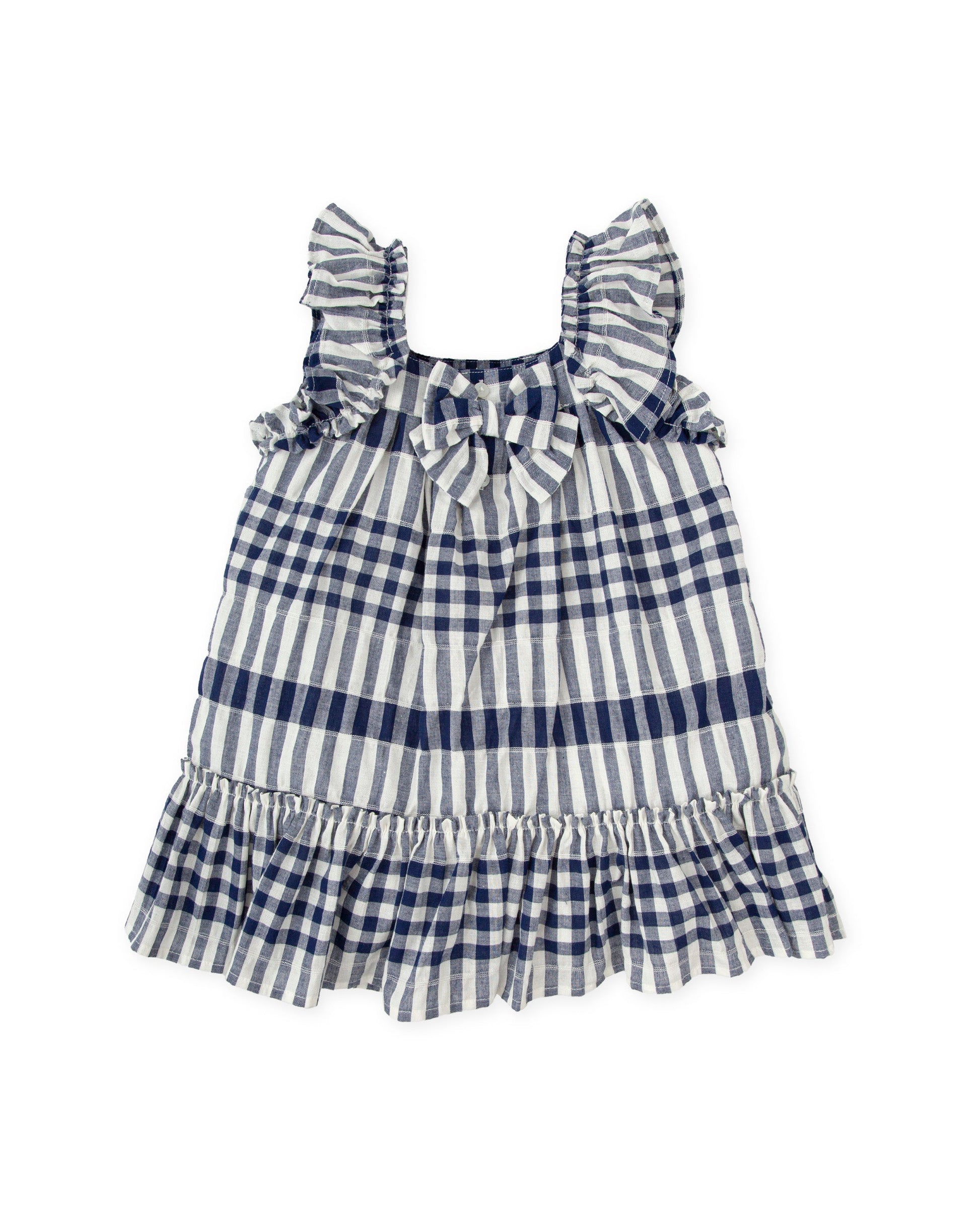 Girls' Navy Gingham Ruffle Dress - Soft Cotton Blend, Perfect for Summer