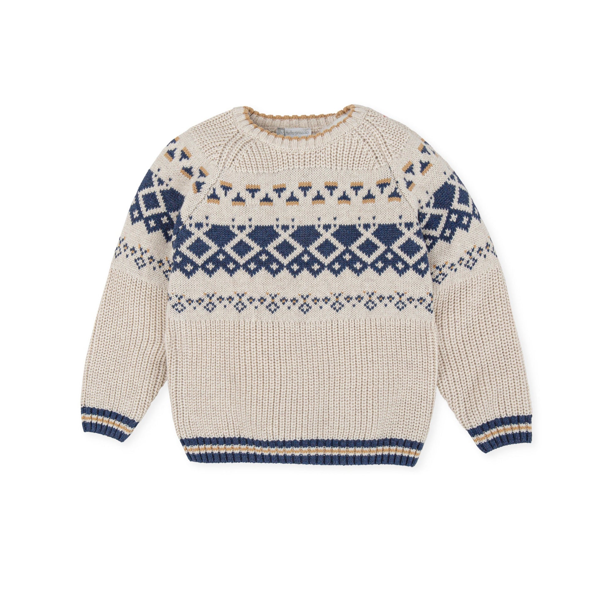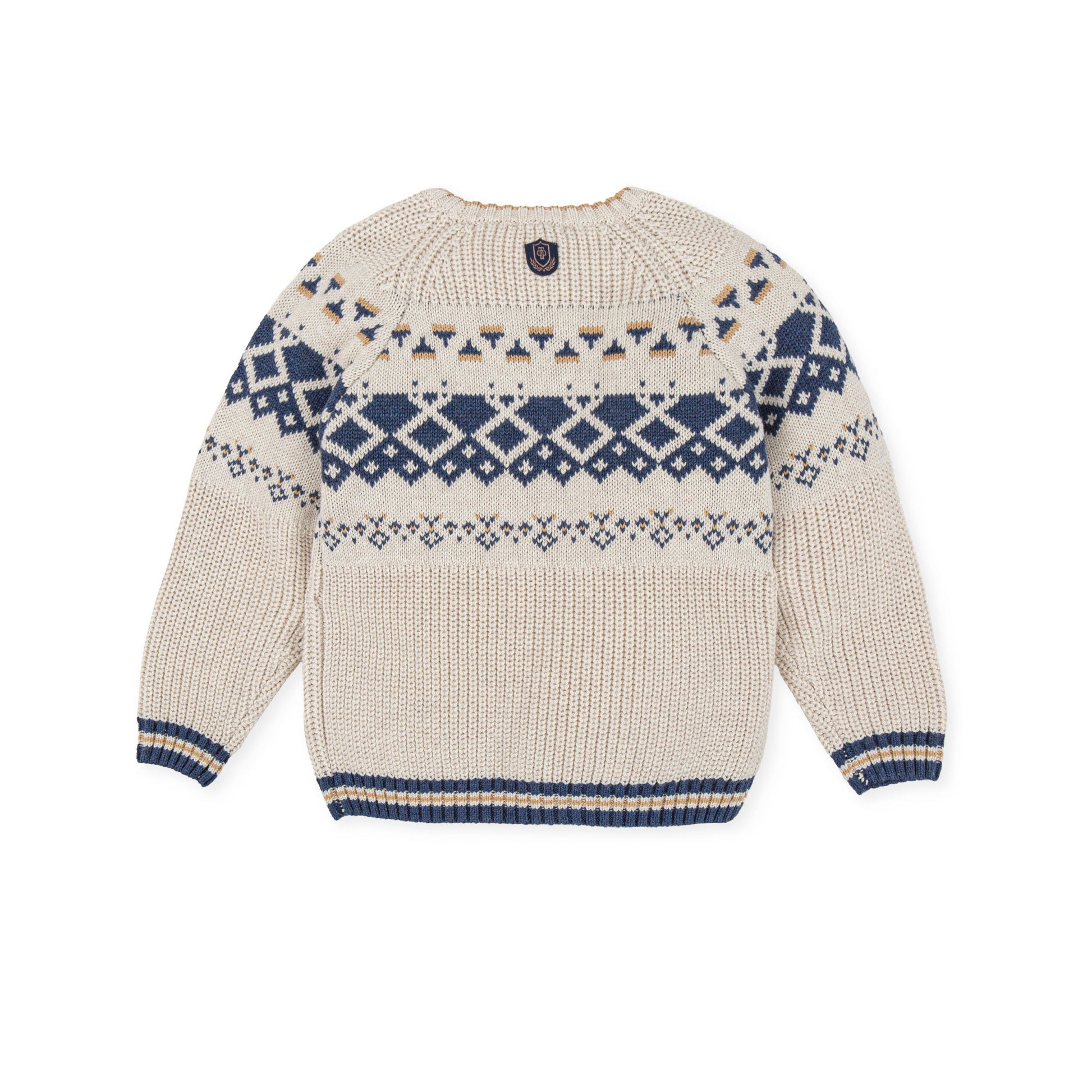 Elegant Ecru Knit Sweater with Fretwork Detail - Cotton Blend