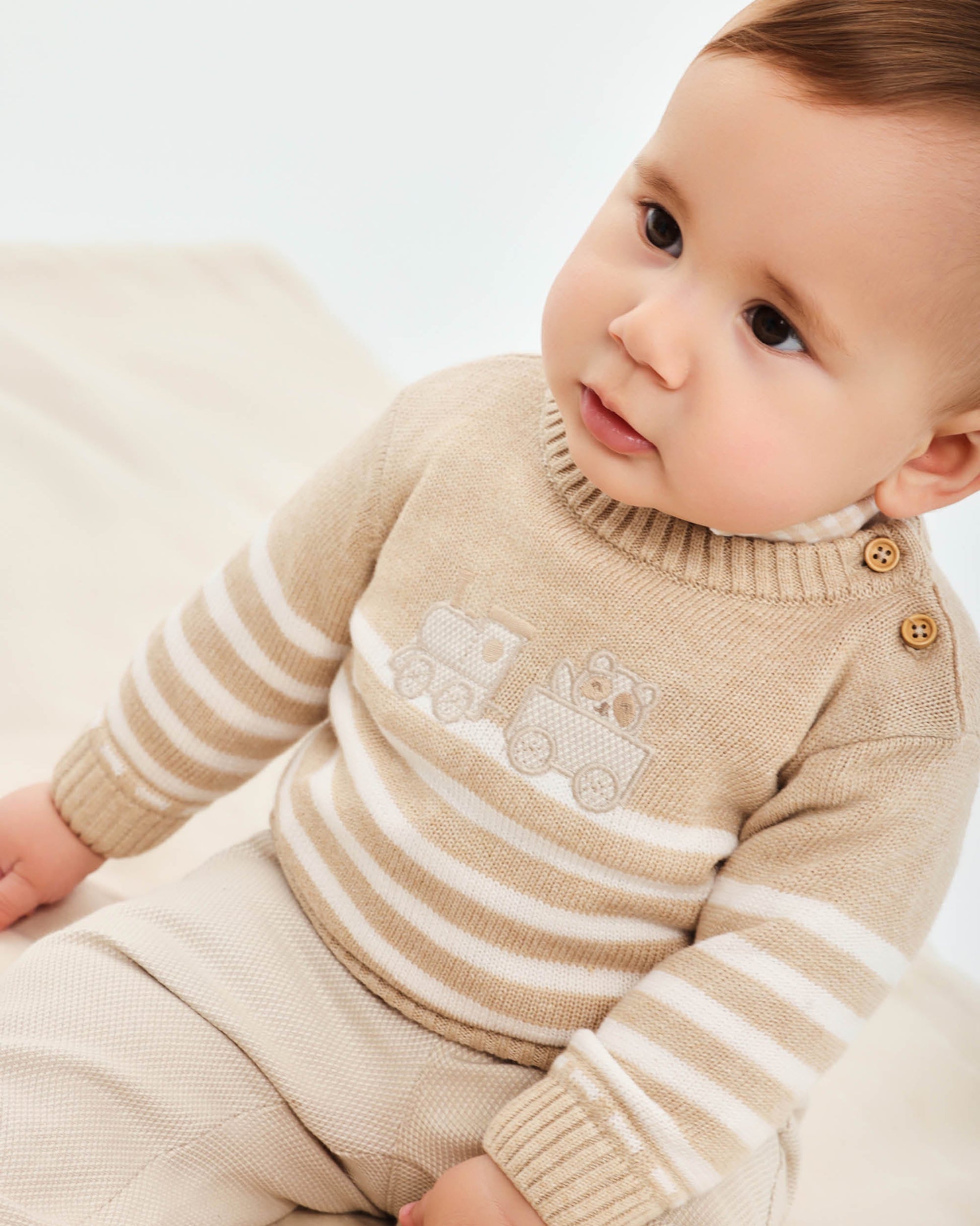 Cozy Beige Striped Knit Baby Sweater with Fun Train Design
