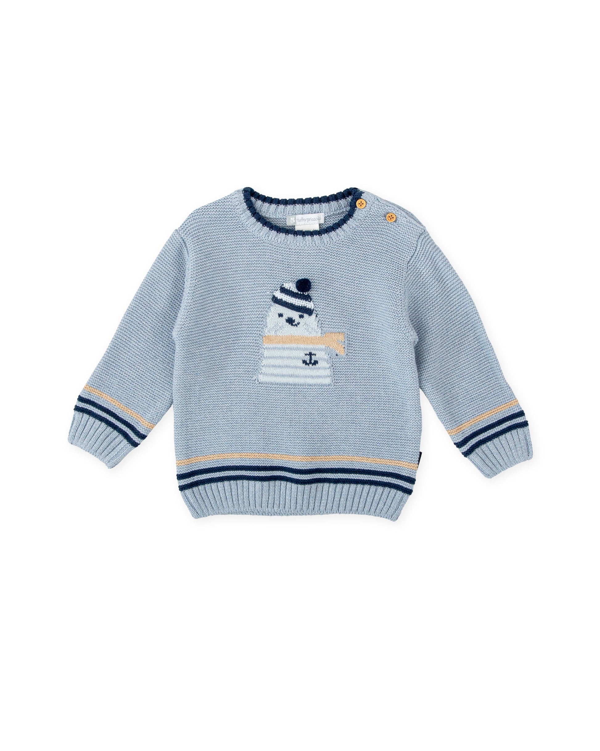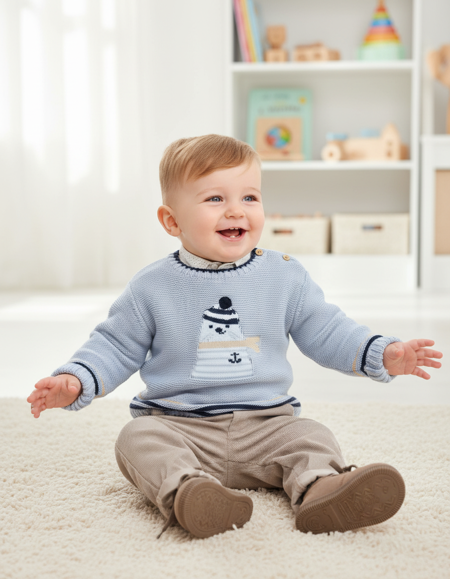 Wrap your little one in comfort with our Charming Sailor Seal Knit Sweater, designed to add a playful nautical vibe to chilly days. Expertly crafted from a soft cotton-blend tricot, this delightful sweater showcases an adorable sailor seal motif, adding a touch of marine magic to any outfit. Contrast stripes at the hem and cuffs, alongside cozy ribbed trims, ensure warmth and style.