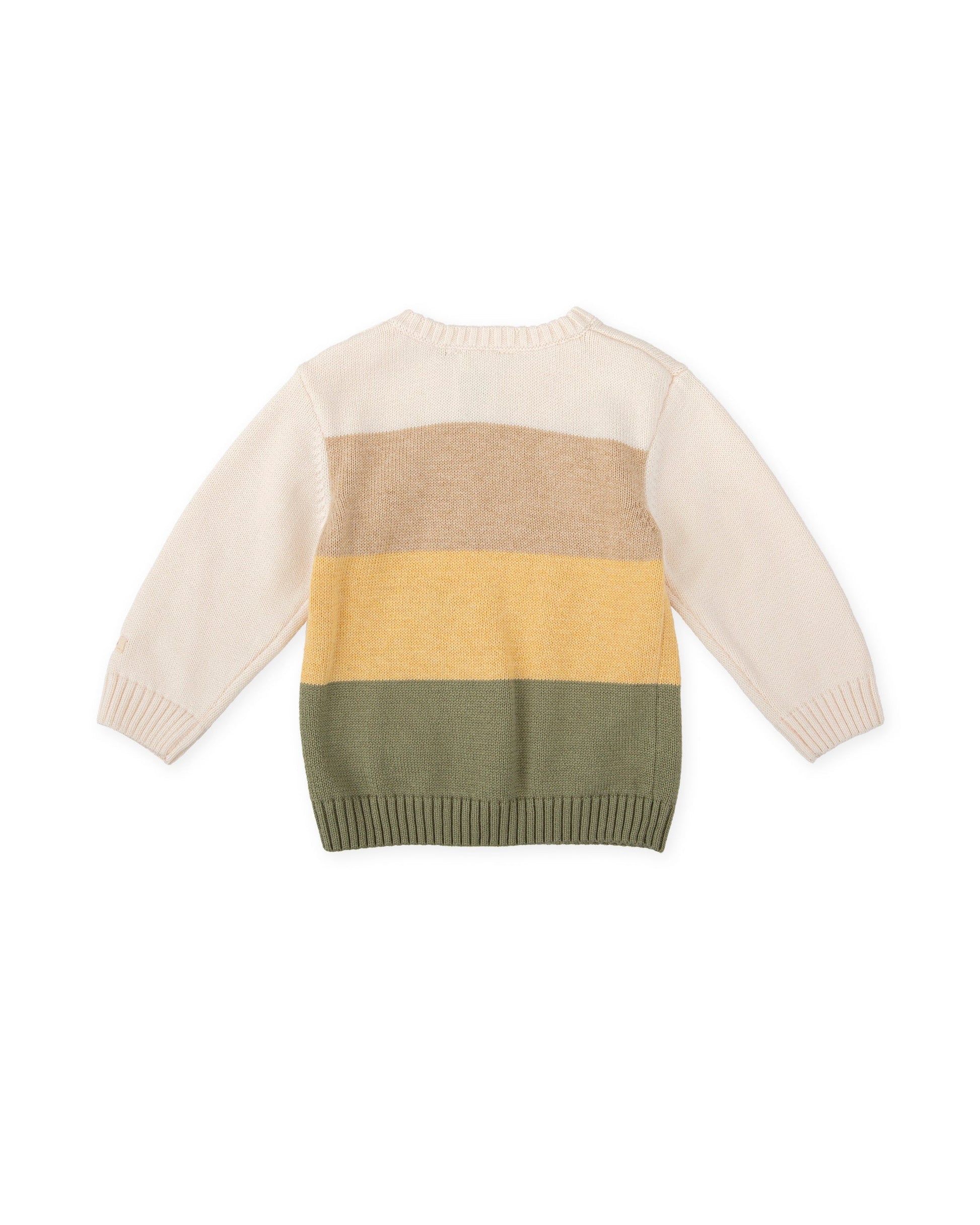 Elevate your child's wardrobe with our cozy multicolor knit sweater, featuring a delightful blend of cream, tan, mustard, and olive green. Crafted from a soft cotton blend, this sweater ensures all-day comfort and warmth, making it perfect for cool weather adventures.