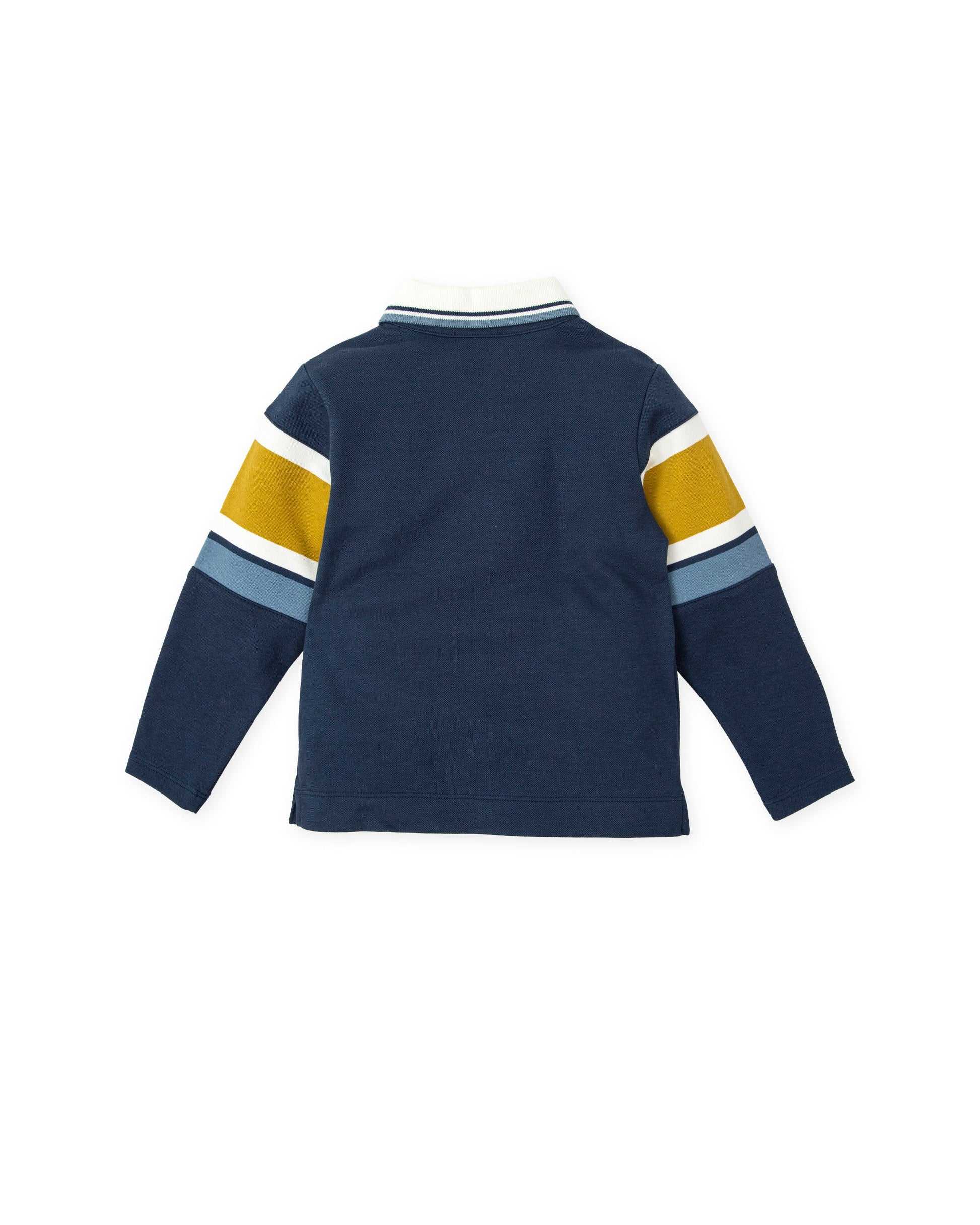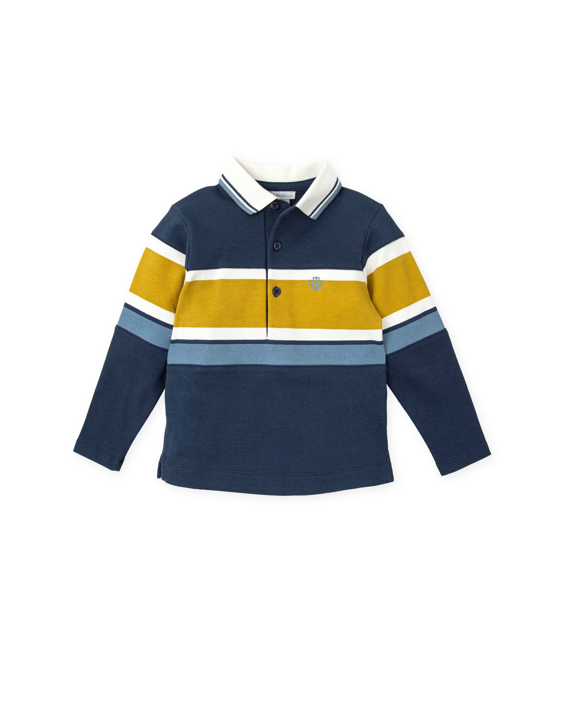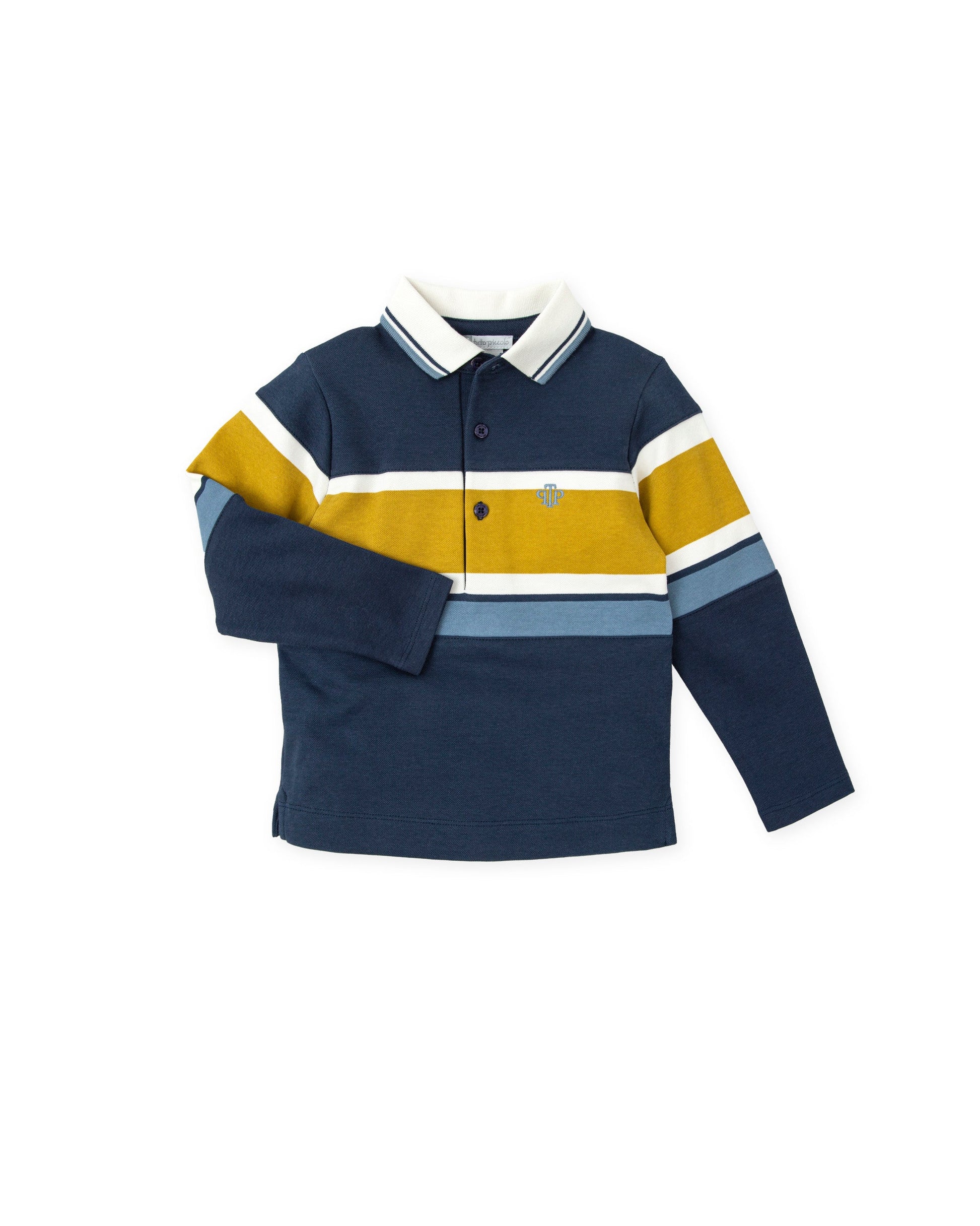 Elevate your casual wardrobe with our stylish navy blue polo shirt, crafted from premium marine granite knit fabric. Its sophisticated design is enhanced by elegant white and ochre stripes, making it a versatile choice for any occasion. Featuring a ribbed collar, detailed embroidery on the front, and a classic buttoned placket, this polo shirt offers both comfort and style.
