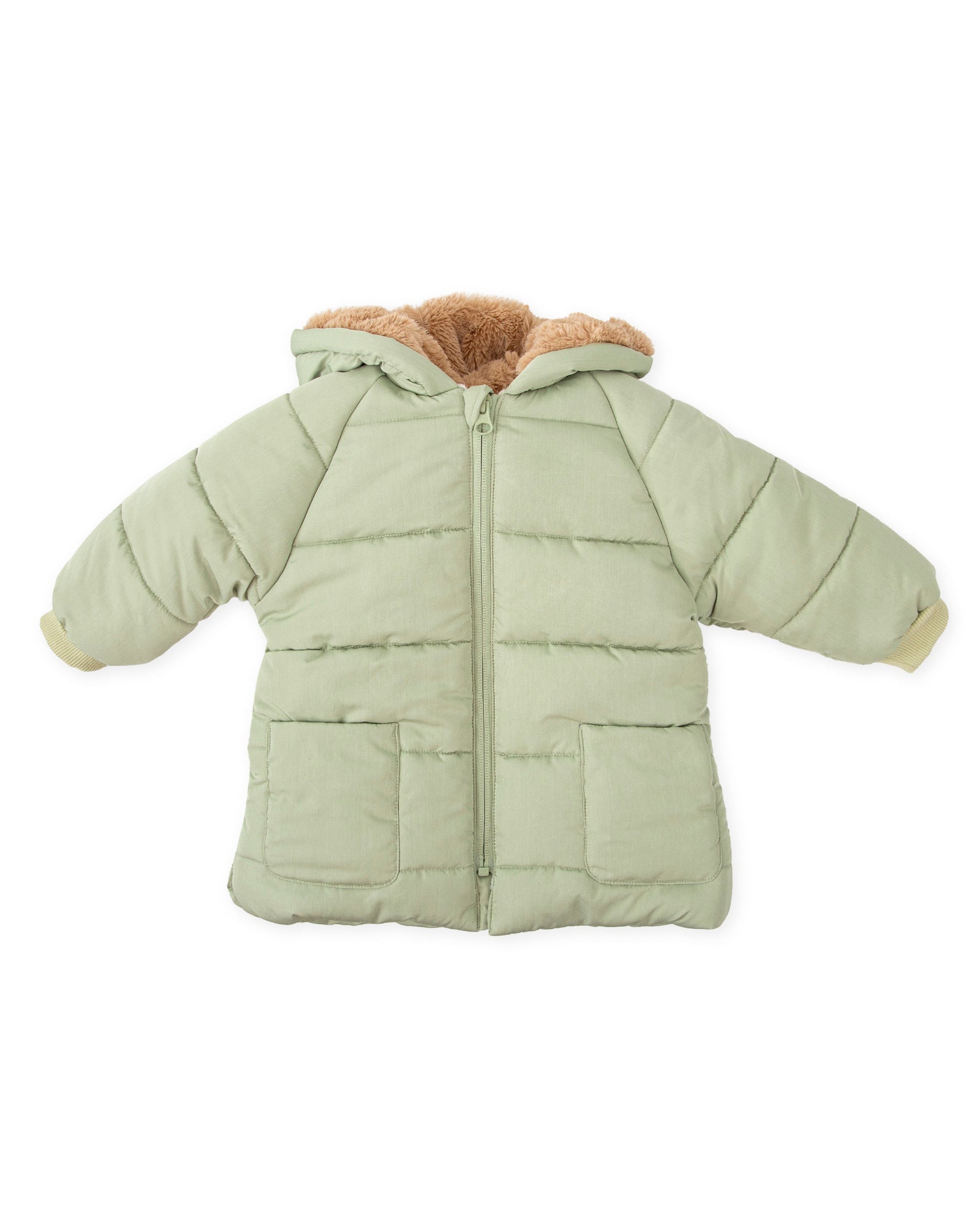 Embrace winter adventures with our charming khaki padded parka, expertly crafted for young explorers. This parka is made from soft microfiber and features a plush beige fleece lining, providing warmth and comfort. A full front zipper, spacious patch pockets, and a whimsical hood adorned with bear ears complete this delightful design. Lightweight yet cozy, it's perfect for layering during cold weather.