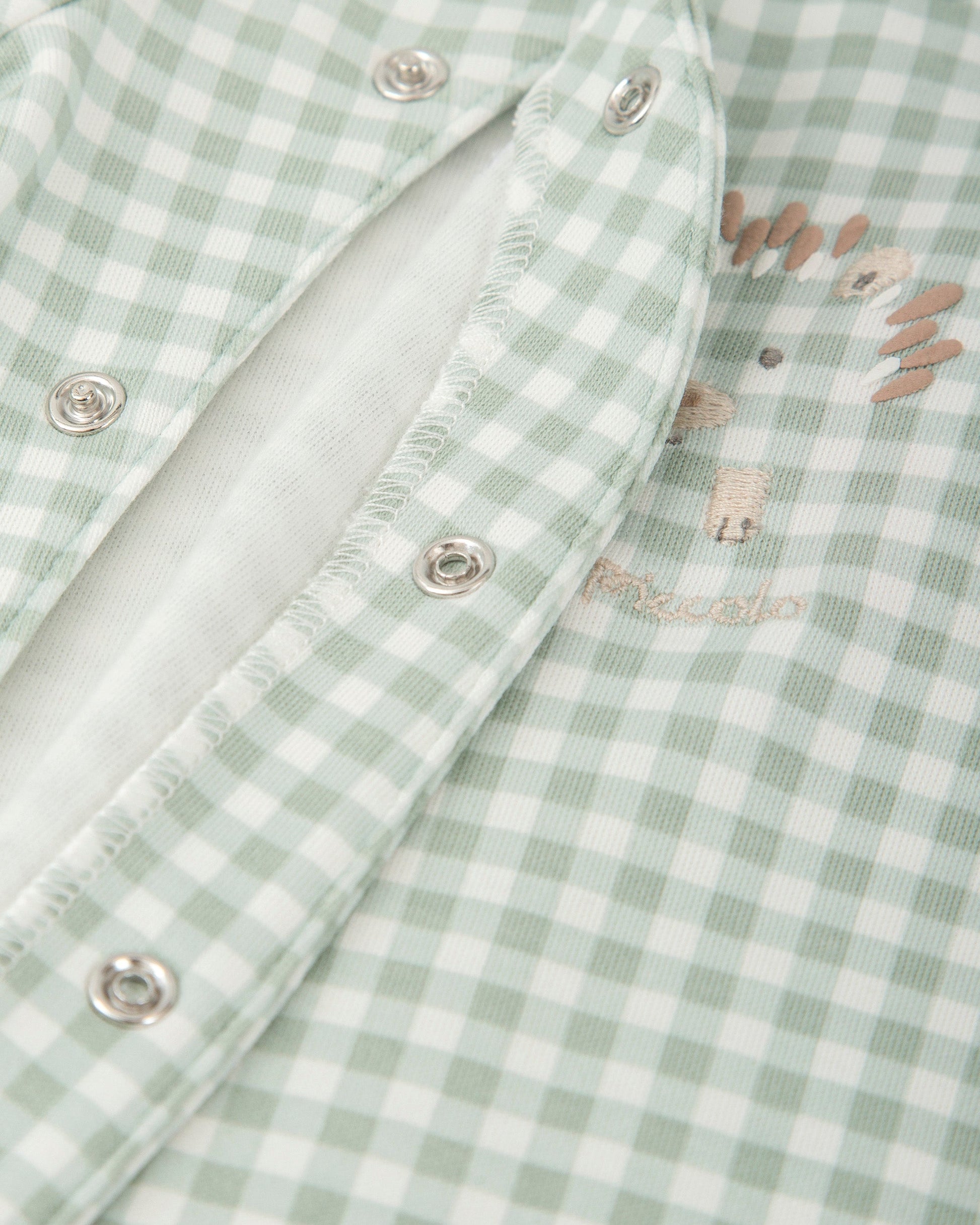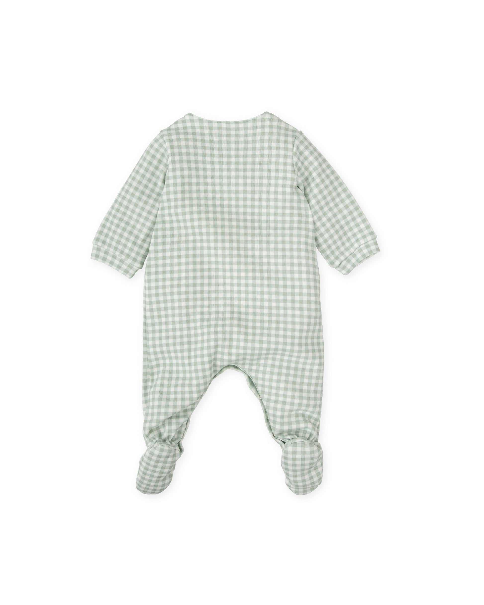 Introduce your little one to comfort with our cozy green gingham footed baby romper, expertly crafted for warmth and style. This charming one-piece features a delightful hedgehog embroidery on the chest, adding a playful touch to your baby's wardrobe.