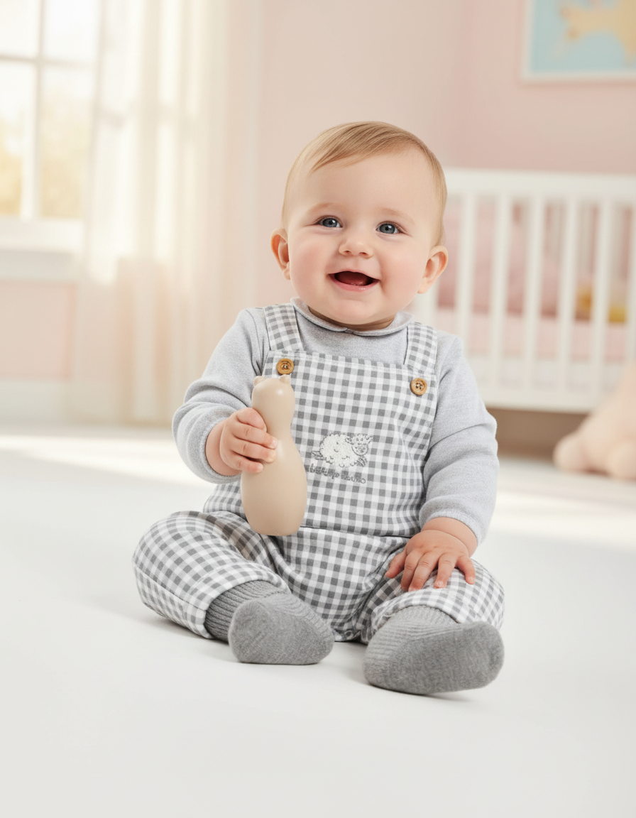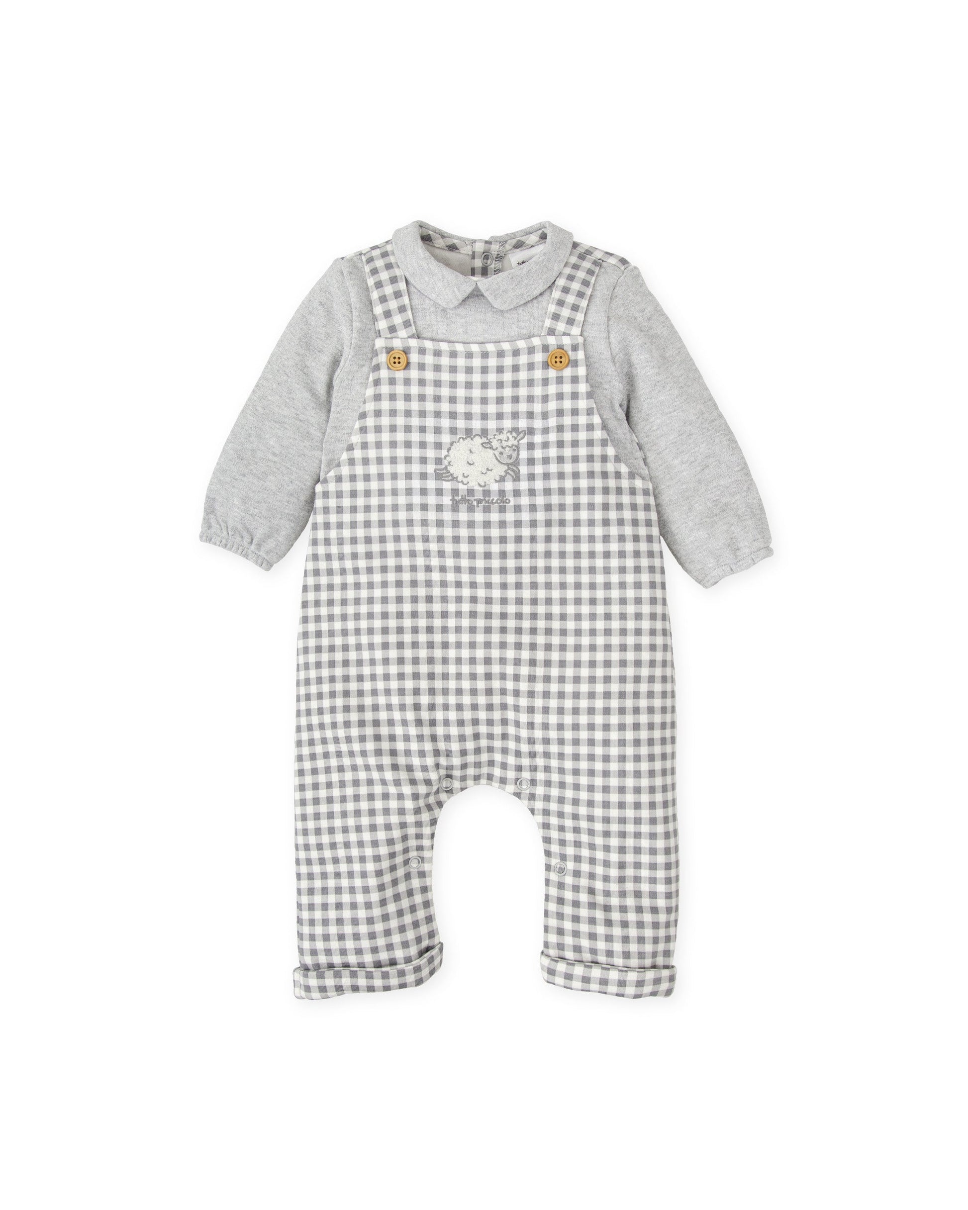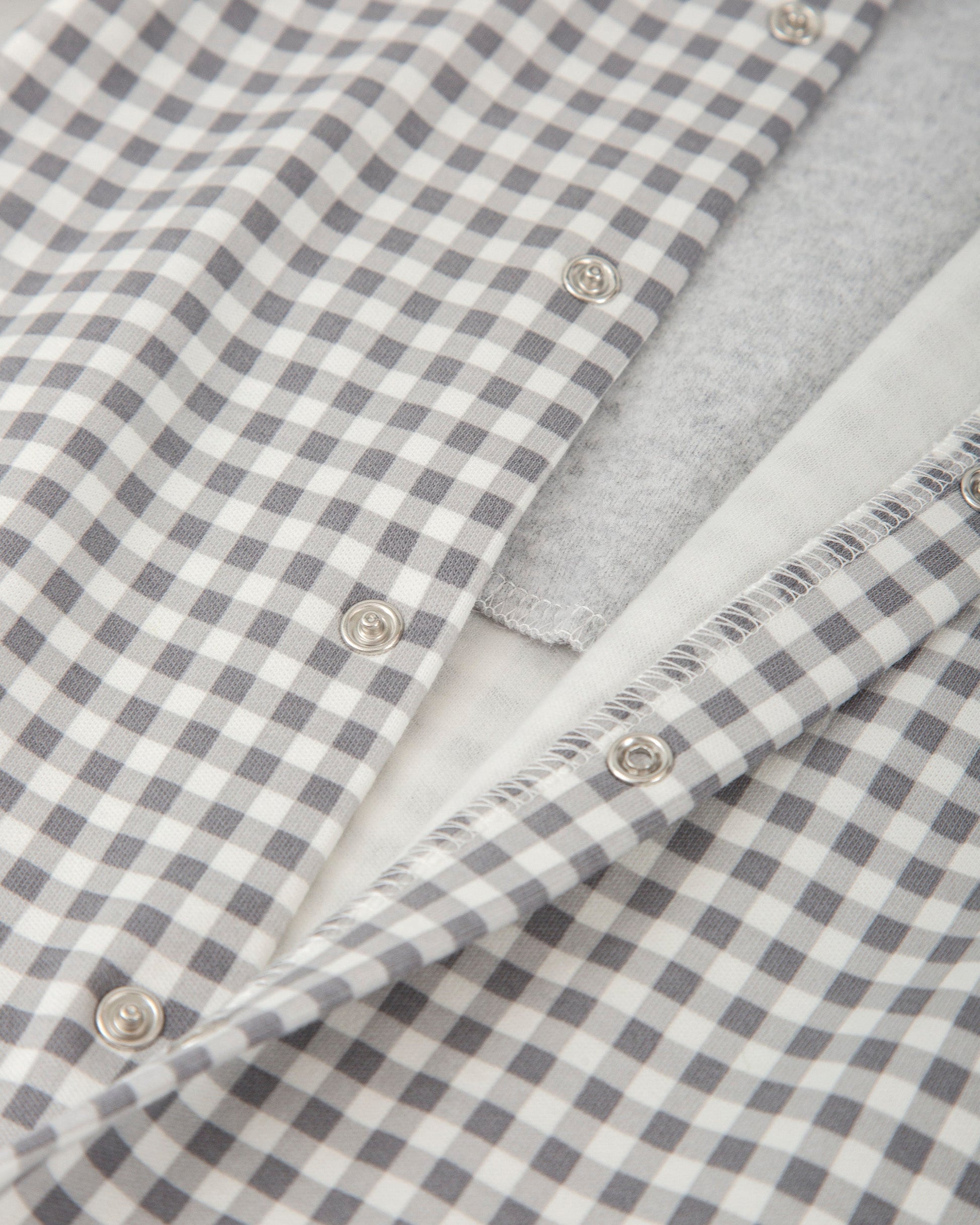 Discover the perfect blend of style and comfort with our cozy gray gingham baby jumpsuit. Designed to mimic the layered look of overalls, this one-piece wonder eliminates fuss while ensuring your little one stays snug. Crafted from soft sweater cotton, it features a charming mock bib and delightful sheep embroidery, adding a playful touch to your baby's wardrobe.