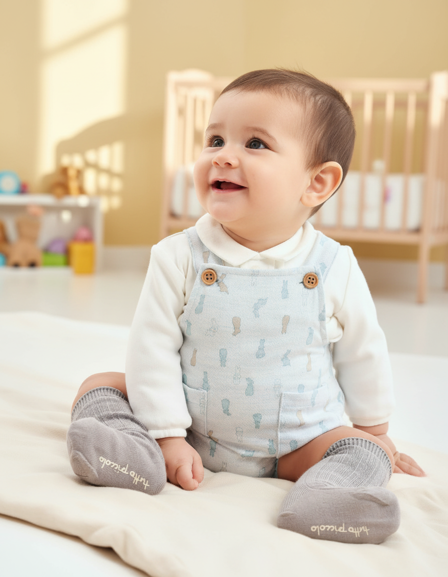 Discover the charm of our Sky Blue Bunny Print Baby Romper, crafted from a textured cotton-blend fabric that feels as delightful as it looks. Featuring an exclusive bunny design, this romper is perfect for adding a whimsical touch to your baby's wardrobe. Designed for convenience, it includes criss-cross straps with adjustable wooden buttons and a snap closure at the inseam for seamless diaper changes. The elasticated back and leg openings ensure a snug yet comfortable fit, accommodating your little one's every move.