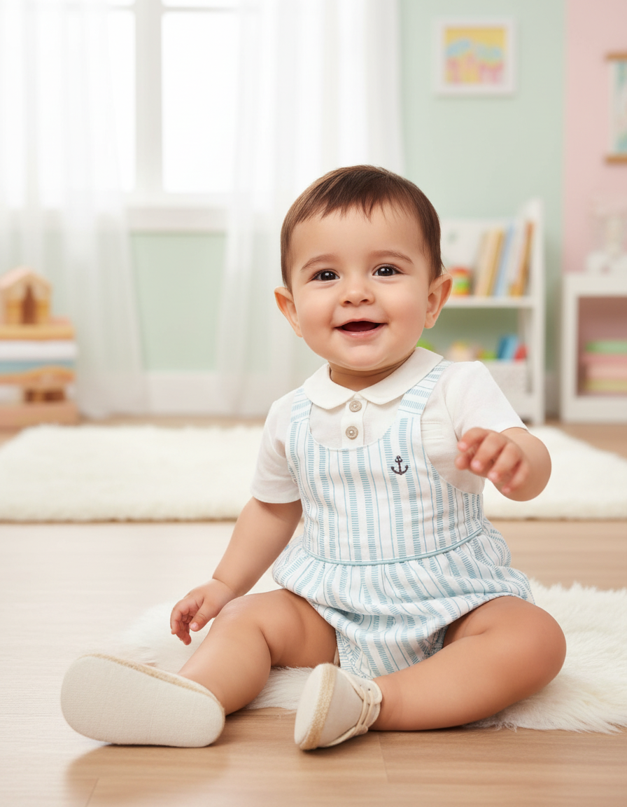 Discover the perfect blend of style and comfort with our Aquamarine Baby Striped Cotton Romper. Crafted from 100% breathable cotton, this sleeveless bubble outfit keeps your little one cool and comfy. Featuring classic blue and white stripes, its gentle gathered accents make it a stylish choice for sunny days, special occasions, or everyday wear.