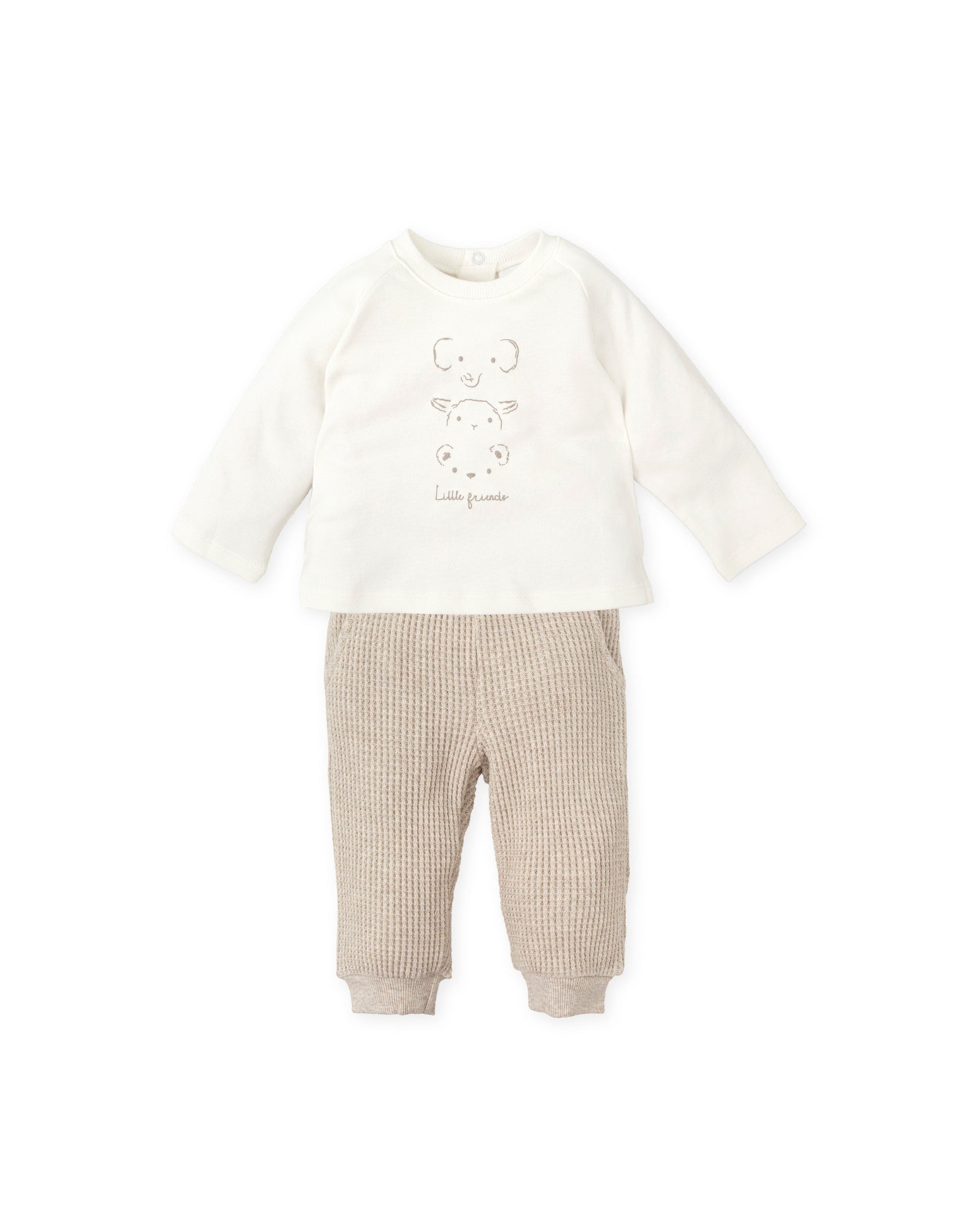Elevate your little one's wardrobe with this charming 2-piece baby outfit set by Tutto Piccolo, featuring a pure white cotton top and coordinating sand-toned pants. Adorned with an enchanting animal face silhouette, this ensemble combines playful style with comfort. The pants include a practical snap-button closure at the back and are crafted with a soft ribbed waistband and cuffs, ensuring a snug yet gentle fit.