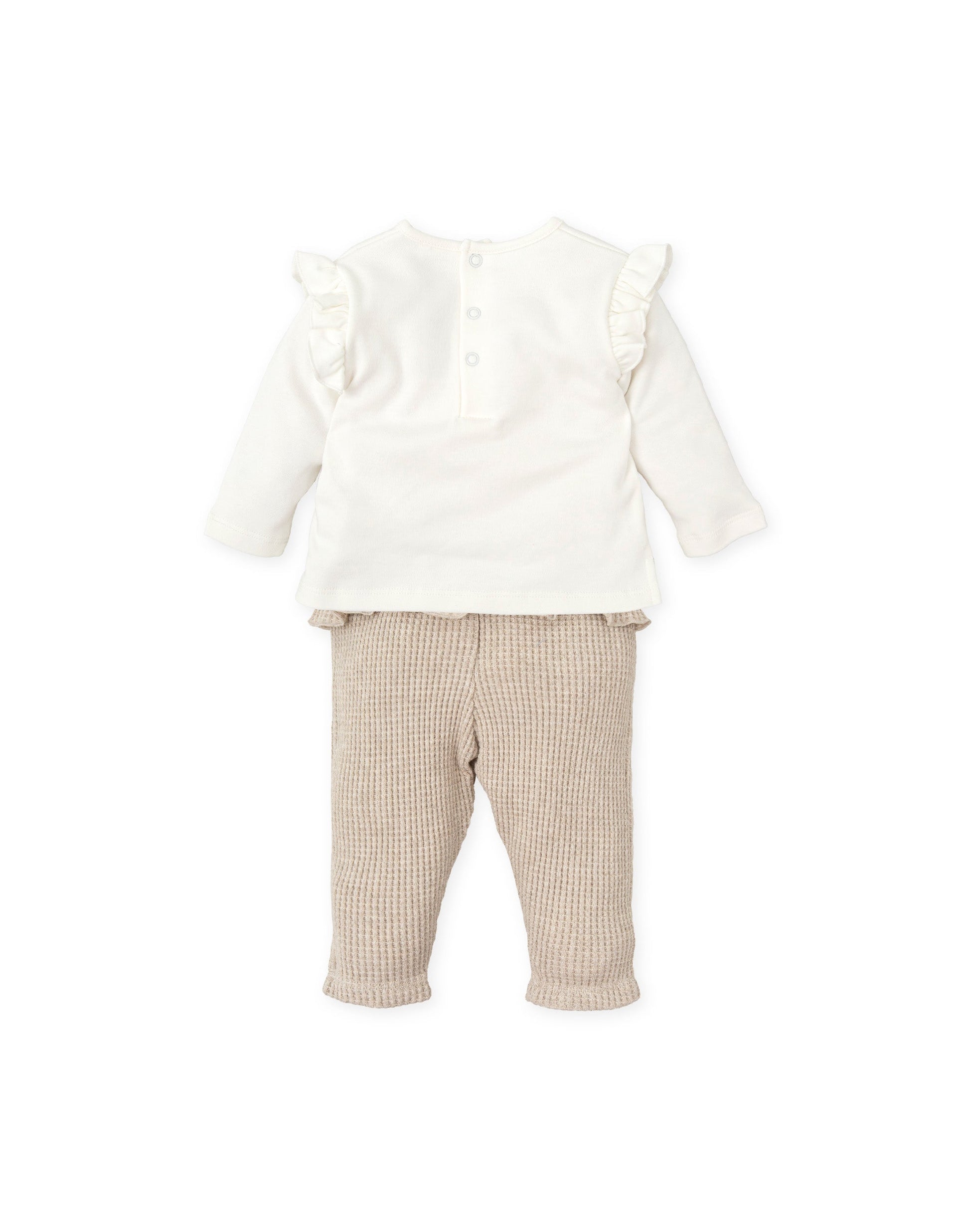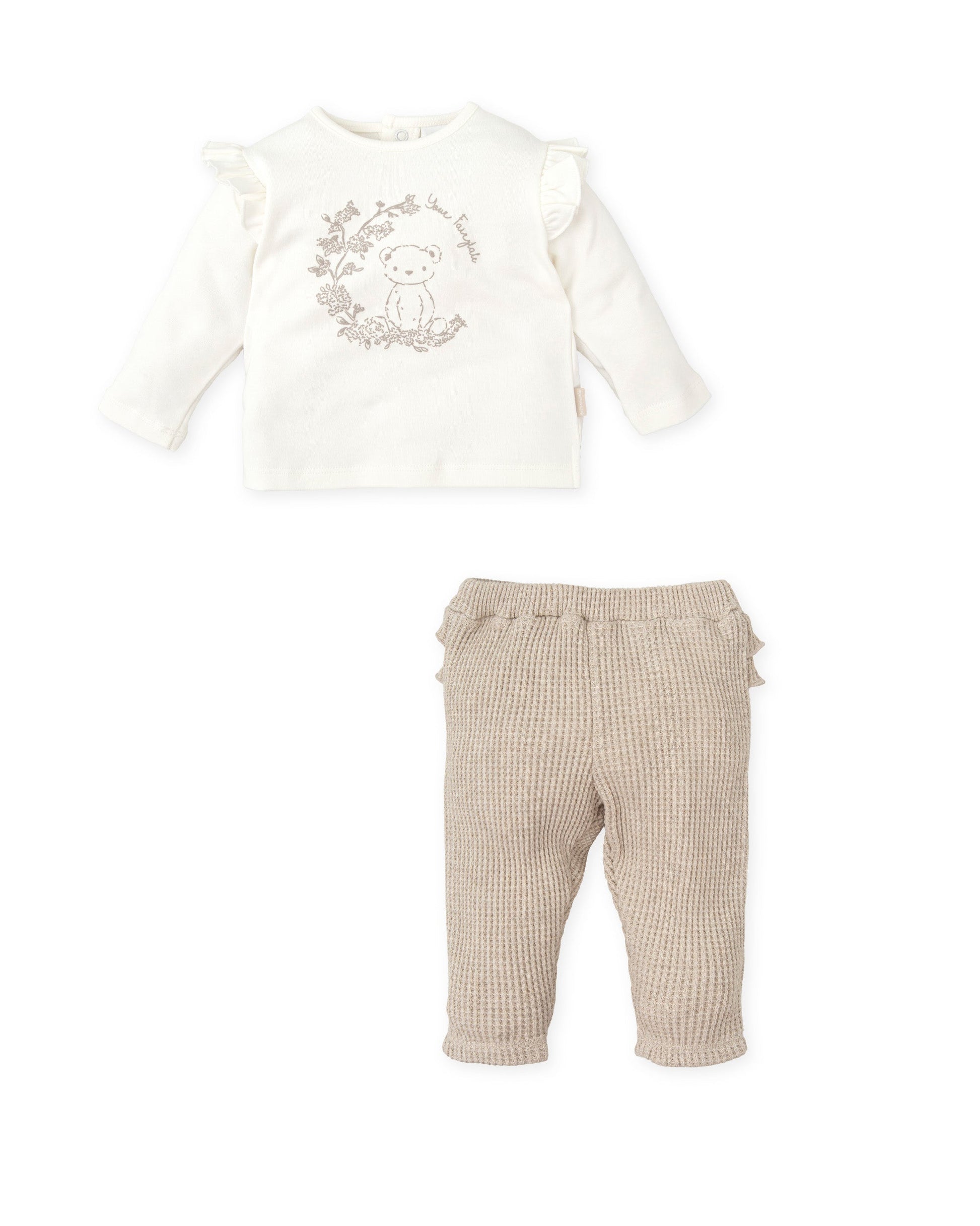 Discover the perfect blend of comfort and style with this adorable 2-piece baby set by Tutto Piccolo. Crafted from soft, organic cotton, this chemical-free white interlock set features charming sand grofre fabric accents. The top boasts delicate ruffle detailing on the armholes and an enchanting teddy bear print, complete with a convenient snap-button back opening. The footless trousers offer a gentle elastic waistband and playful ruffles at the back, ensuring your little one's comfort and freedom of movement.