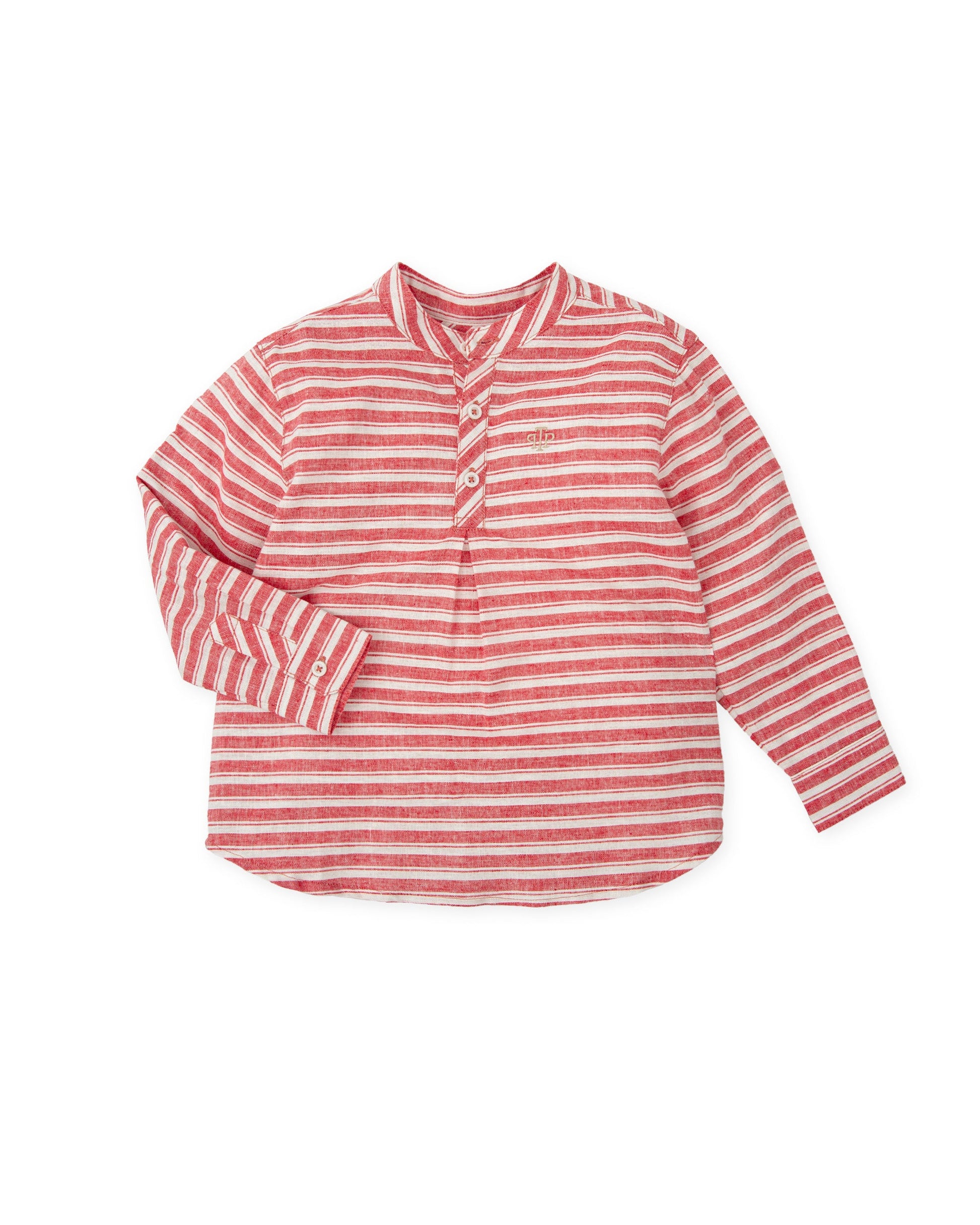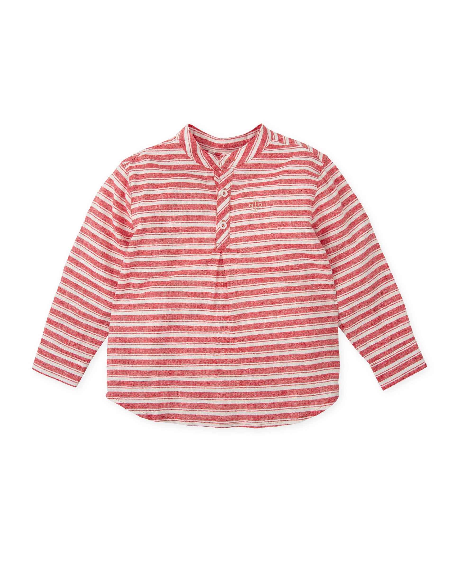 Baby Boy Red Striped Grandad Collar Shirt | Linen-Cotton Long Sleeve