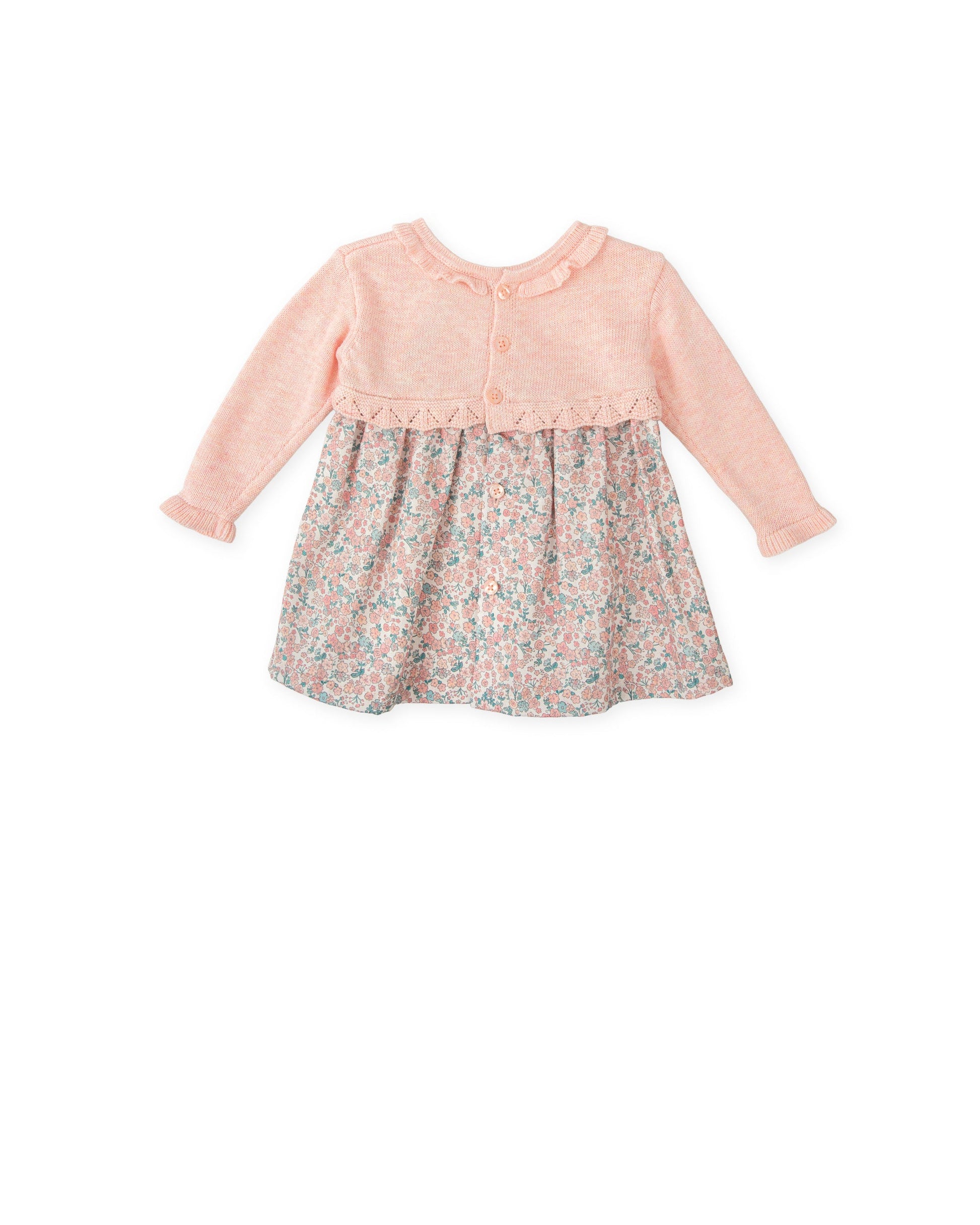 Discover the perfect blend of comfort and style with our Pink Floral Baby Knit Dress, designed for cooler days. This adorable baby outfit features a cozy knit top enhanced with delicate crochet trim and charming flower appliqués. Paired with a lightweight, cotton-blend skirt adorned with a vibrant floral print, it offers a delightful two-in-one look. The convenient back button closure ensures easy dressing. Tights are not included.