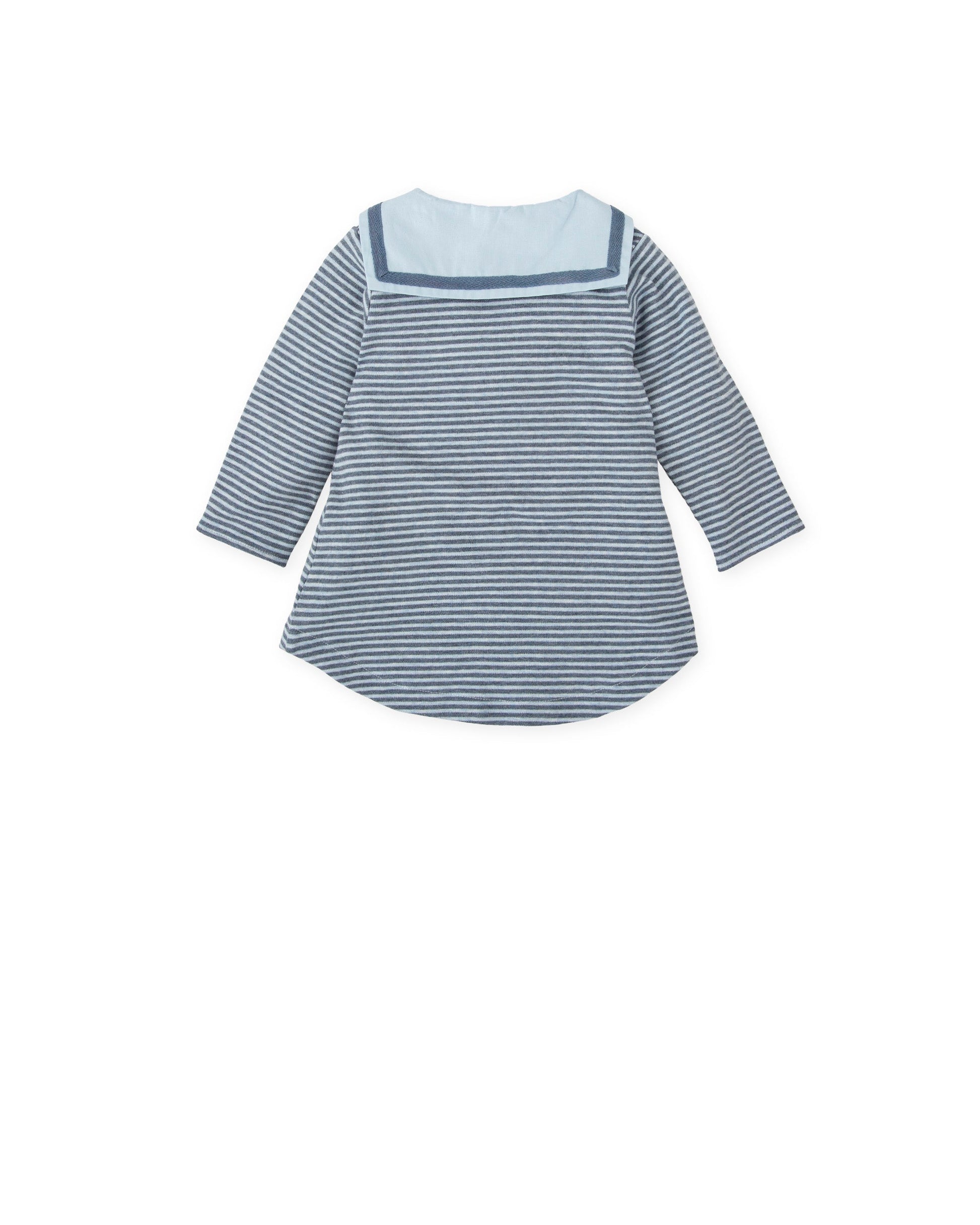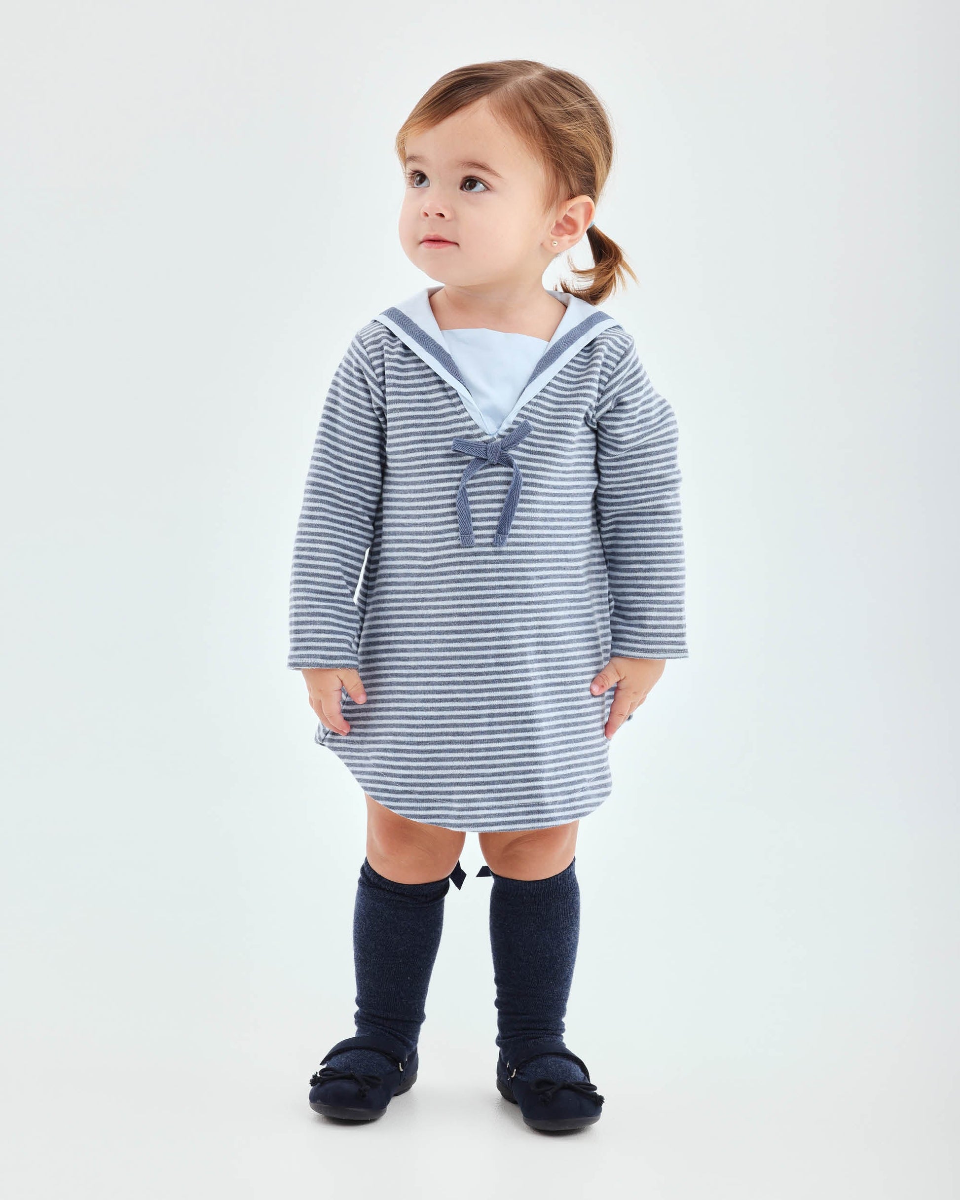 Embrace nautical elegance with comfort in our Navy & Ivory Striped Sailor Dress. Crafted from soft, sweater-like cotton, this adorable long-sleeve dress features a classic sailor collar in pale blue complemented by a charming knit bow. The convenient velcro neckline ensures easy on-and-off, combining practicality with style. Tights not included, available separately. Why Parents Love It: